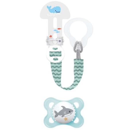 Le kit sucette silicone avec attache-sucette MAM se compose d'une sucette anatomique respectant la forme de la bouche du bébé ainsi que d'un attache-sucette. Ce kit a été formulé pour les bébés âgés de 2 à 6 mois.