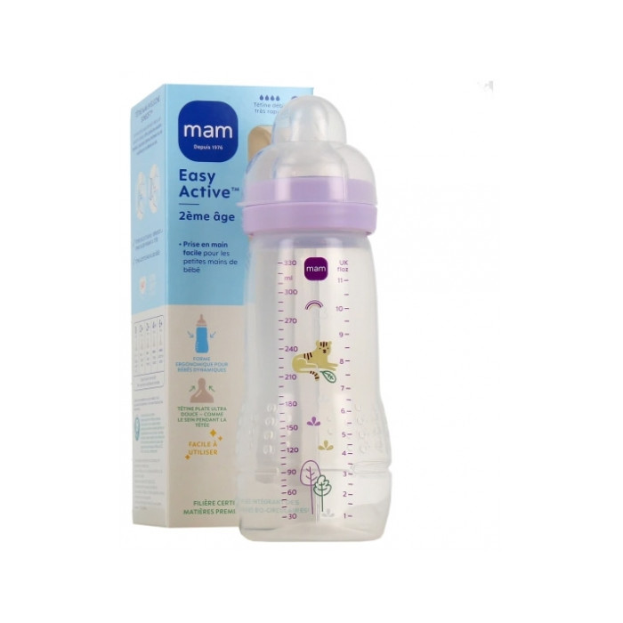 MAM Easy Active Biberon 2ème Âge 330 ml 6 Mois et + Débit Très Rapide - Couleur : Lilas est un incontournable pour les bébés en pleine croissance, à partir de l'âge de 6 mois.