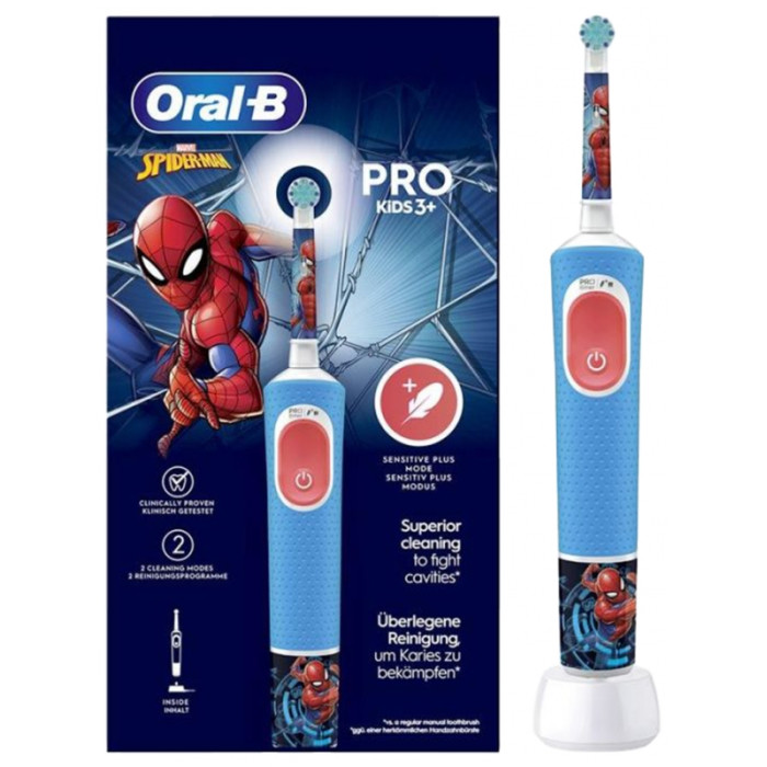 Oral-B Pro Kids 3 Ans et + Brosse À Dents Électrique - Modèle : Spiderman est une brosse à dents électrique rechargeable adaptée aux enfants à partir de 3 ans. Elle est dotée d'une petite brossette aux poils ultra-doux adaptée pour les bouches des enfants et d'un manche étanche pour plus de sécurité.