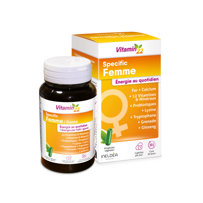 Association unique de Vitamines, Minéraux, Extraits de plantes, Acides aminés et Probiotiques, Vitamin’22 Specific Femme est la réponse pour toutes les femmes qui souhaitent une cure de fond véritablement adapté à leurs besoins tels que :
