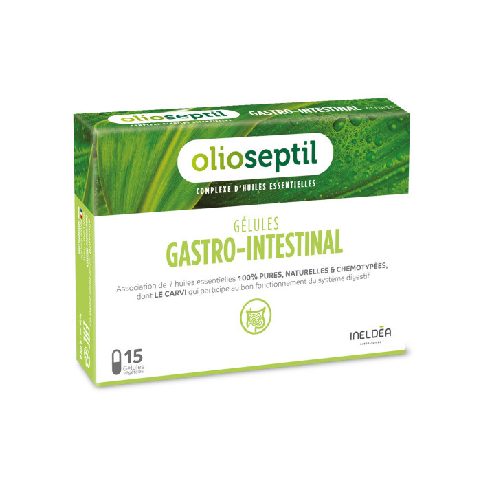 Présenté en gélules végétales, OLIOSEPTIL® Gastro-intestinal est un complexe d’huiles essentielles 100% pures et naturelles et chémotypées, micro-émulsionnées sur un support d’huile d’olive de 1ère pression à froid, en gélule végétale. Ce complexe contient notamment de l’huile essentielle de Carvi, qui participe à l’assainissement et au bon fonctionnement du système digestif. Idéal en cas de sensibilité individuelle ou de changements d’habitudes alimentaires (repas pris hors domicile, déplacement à l’étranger…).