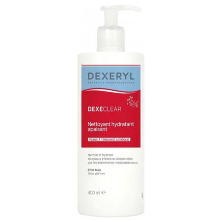 Dexeryl Dexeclear Nettoyant Hydratant Apaisant 400 ml est conçu pour les peaux à tendance acnéique fragilisées par les traitements médicamenteux.