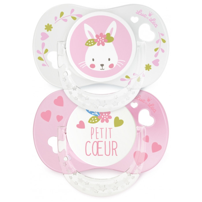 Luc et Léa 2 Sucettes Silicone Anatomiques avec Anneau 0-6 Mois - Modèle : Lapin + Coeur